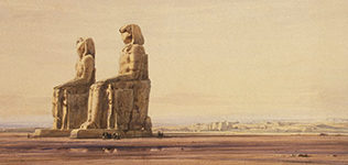 Imagen: Colossos de Memnon con Tebas al fondo, acuarela y gouache de Eduard Hildebrandt (1818-1868)