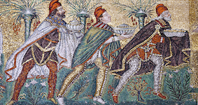 Imagen: Los reyes magos ofrecen a Jesús oro, incienso y mirra, mosaico bizantino en la Basilica di Sant'Apollinare Nuovo (c. 540 dC)