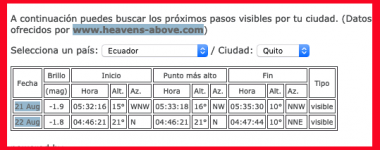 En el sitio web de la Estación Espacial ( http://www.estacionespacial.com/ ) hay mucha información y se puede saber cuándo pasará la nave sobre tu ciudad. Y en efecto, pasó sobre Quito el miércoles 21 de agosto a las 5 y treinta y uno de la mañana. Era la luz que vi y que se perdió sobre la colina Pukará en unas condiciones meteorológicas inmejorables. Un día mi nieto Bruno verá con frecuencia la entrada en la atmósfera de naves provenientes de otros planetas… bueno ese ha sido el sueño de varias generaciones, en todo caso espero que lo emocionen y que no pierda jamás el sentido del asombro que es lo que nos hace humanos.